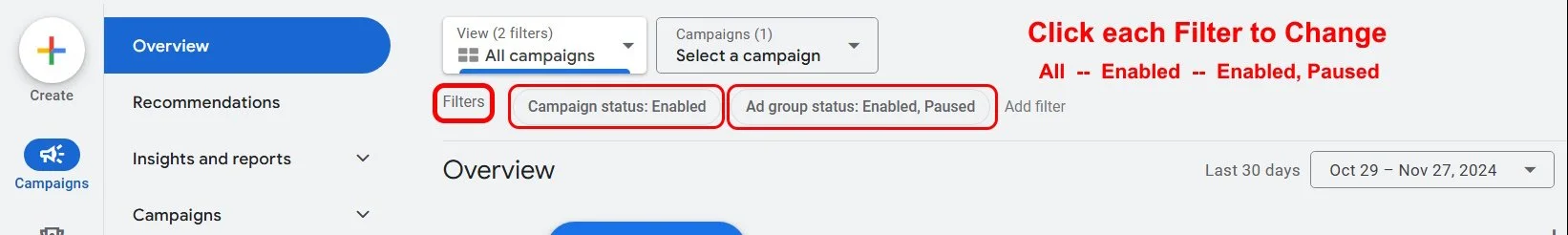 Also, shows how to look at other Campaigns in your Google Ads account.
