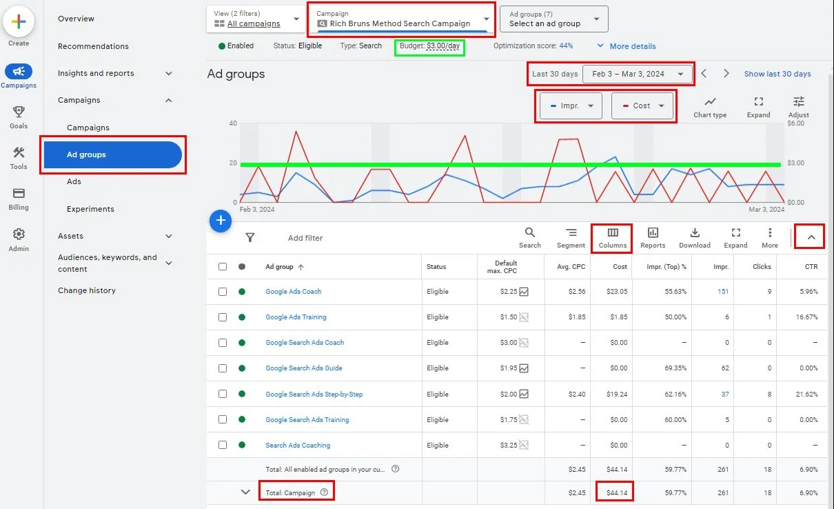 Set RED CHART LINE to show Cost — Shows Cost of all your ads, day by day.